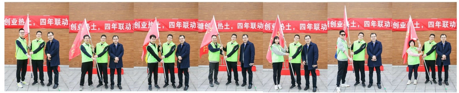 隨后舉行了授旗儀式,李總和唐總向七支隊伍授旗。七面隊旗迎風招展,養心員工的口號響徹江畔,全場充滿熱烈的氣氛和力量。